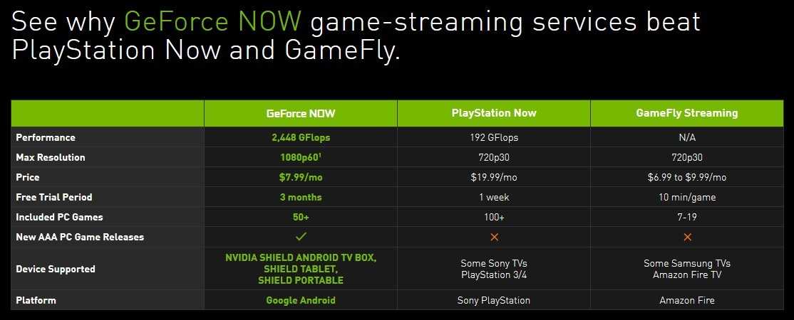 - GeForce NOW – это облачный сервис от NVIDIA, на котором уже сейчас насчитывается более 100 оптимизированных игр. Но, к примеру, таких популярных как GTA V нет. Первый месяц подписки там бесплатен, но дальше стоимость составляет 649 рублей.
