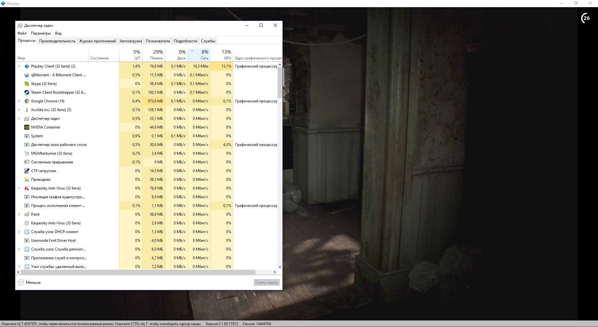 При этом в Диспетчере задач приложение показывает низкую нагрузку на процессор, оперативную память и видеокарту, и загрузку интернет-канала на уровне 18 Мбит/с (при запущенной в разрешении 1080р игре).