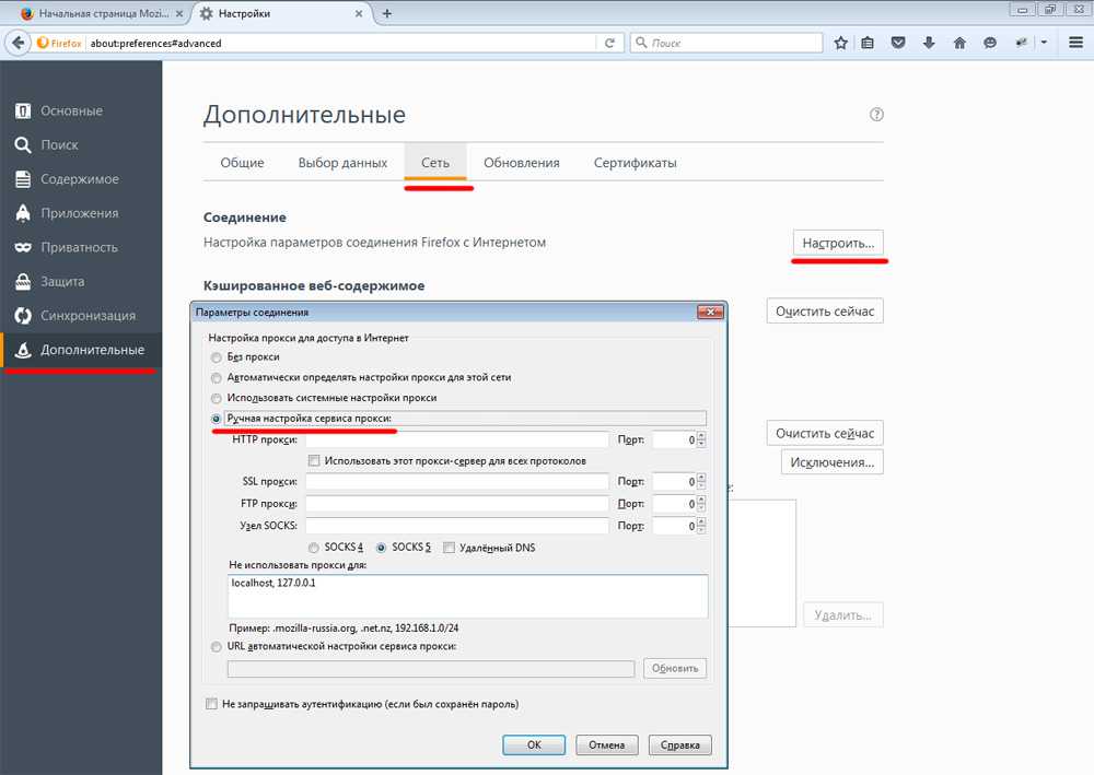Чтобы внести соответствующие изменения в браузер Mozilla Firefox, необходимо последовательно перейти из меню «Настройки» в пункт «Настройки», а затем на вкладку «Дополнительно». Далее, среди перечня дополнительных возможностей следует остановить выбор на строке «Сеть», кликнуть по ней и в открывшемся окне установить флажок напротив строки «Ручная настройка сервиса прокси». Остаётся только внести данные, после чего контакт с прокси будет установлен.