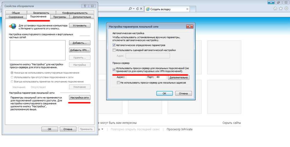 - В Internet Explorer перейти на вкладку «Подключения», нажать кнопку «Настройка сети», где снять отметку напротив надписи «Автоматическое определение параметров». Рядом с пунктом «Использовать прокси-сервер для локальных подключений» поставить нужную отметку. В обоих открытых окнах нажать «ОК».
