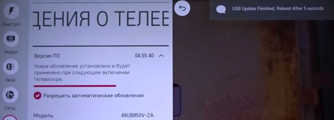 по окончании установки телевизор самостоятельно перезагрузится, а после включения в верхнем правом углу экрана должно появиться сообщение об установке новой версии прошивки.