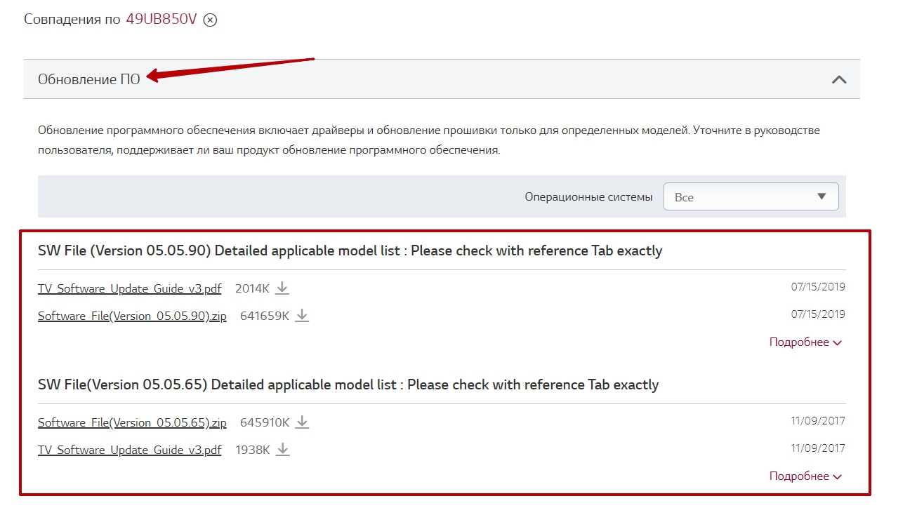 В данном разделе указаны все существующие версии программного обеспечения для вашего TV-приемника. При этом самая «свежая» прошивка всегда находится вверху открывшегося списка. Сравните номер этого обновления с версией оболочки, установленной на вашем телеприемнике.