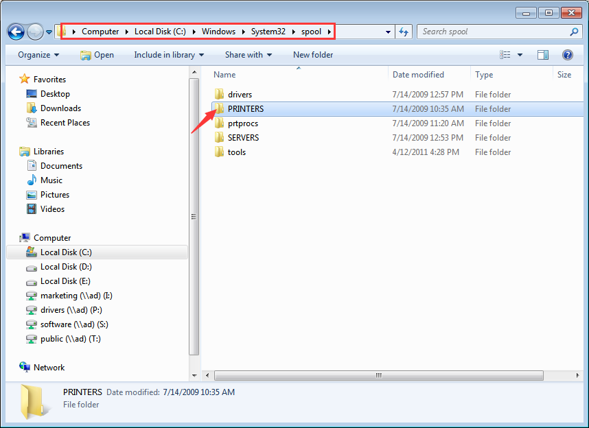 - Зайдите в папку «Printers», которая расположена по адресу «C:\windows\system32\spool\. Удалите все ее содержимое вручную.