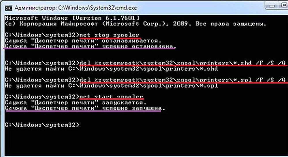 На появившемся чёрном экране командной строки последовательно вводим четыре команды, подчёркнутые на скриншоте красной чертой. Как видно, первая из них – net stop spooler – останавливает диспетчер печати.