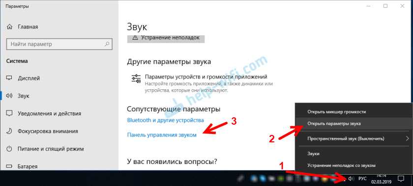 Открываем параметры звука (нажав на соответствующую иконку в трее правой кнопкой мыши) и переходим в панель управления звуком.