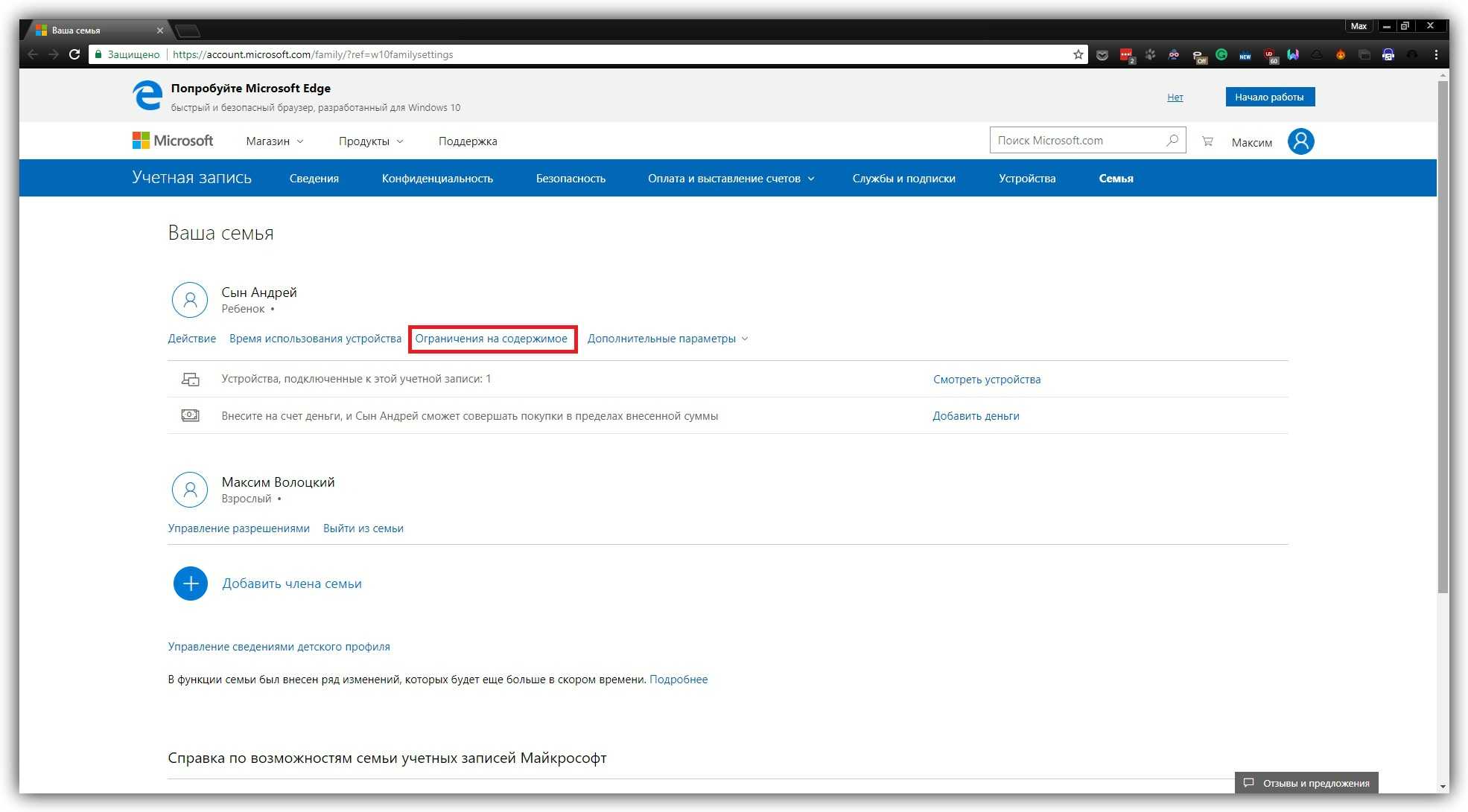 В отличие от старых версий ОС, где все параметры профилей находятся в одном разделе, дальнейшая настройка Windows 10 происходит на сайте Microsoft. Когда откроется сайт, авторизуйтесь через свою учётную запись и откройте раздел «Семья». Увидев профиль ребёнка, кликните рядом с ним на «Ограничение на содержимое».
