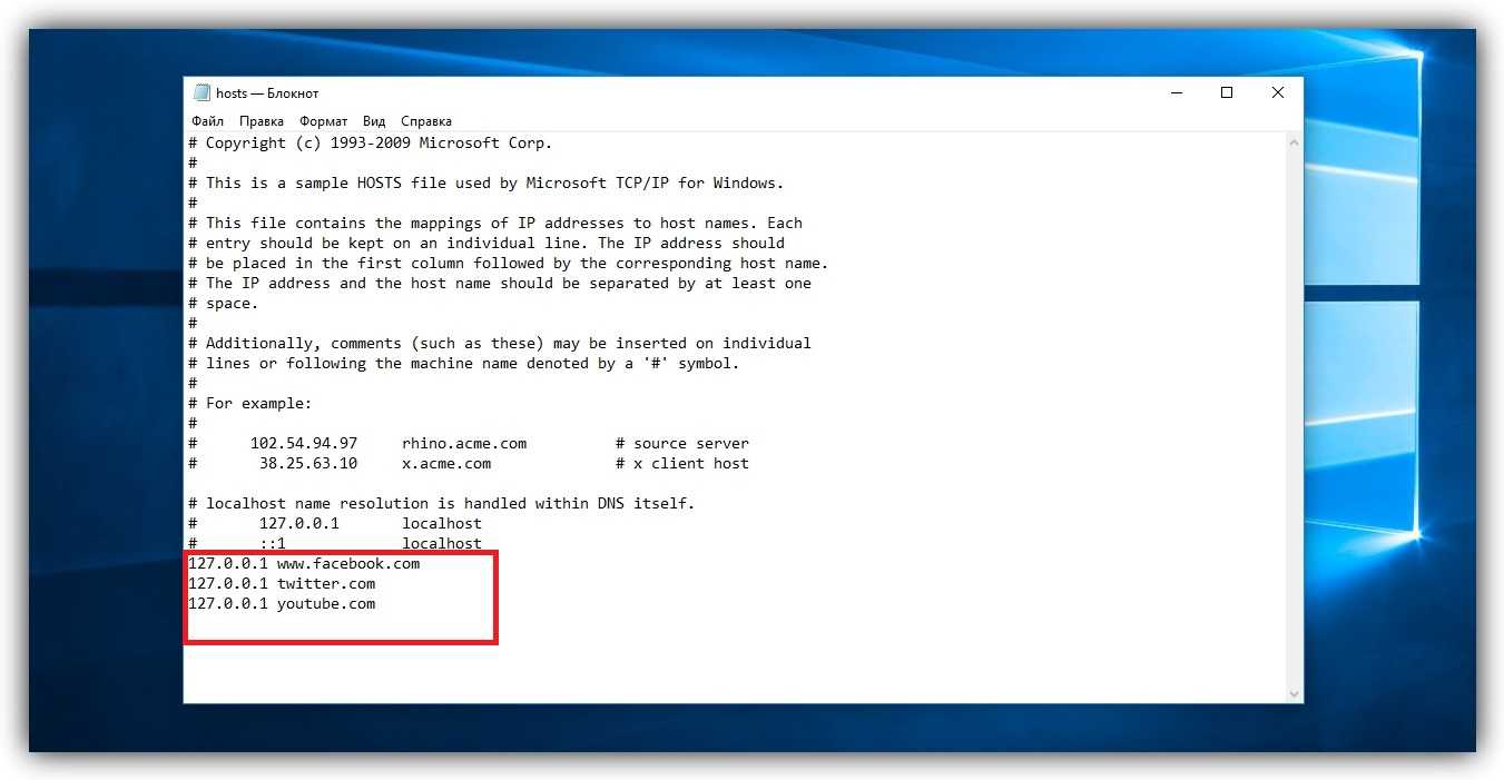 Когда откроется hosts-файл, опуститесь вниз текста и добавьте один или несколько адресов сайтов, которые хотите заблокировать, в таком формате: 127.0.0.1 URL. После цифр обязательно ставьте пробел, вместо URL вводите адрес сайта без части https://. Если добавляете несколько записей, каждую вводите с новой строки. Пример: