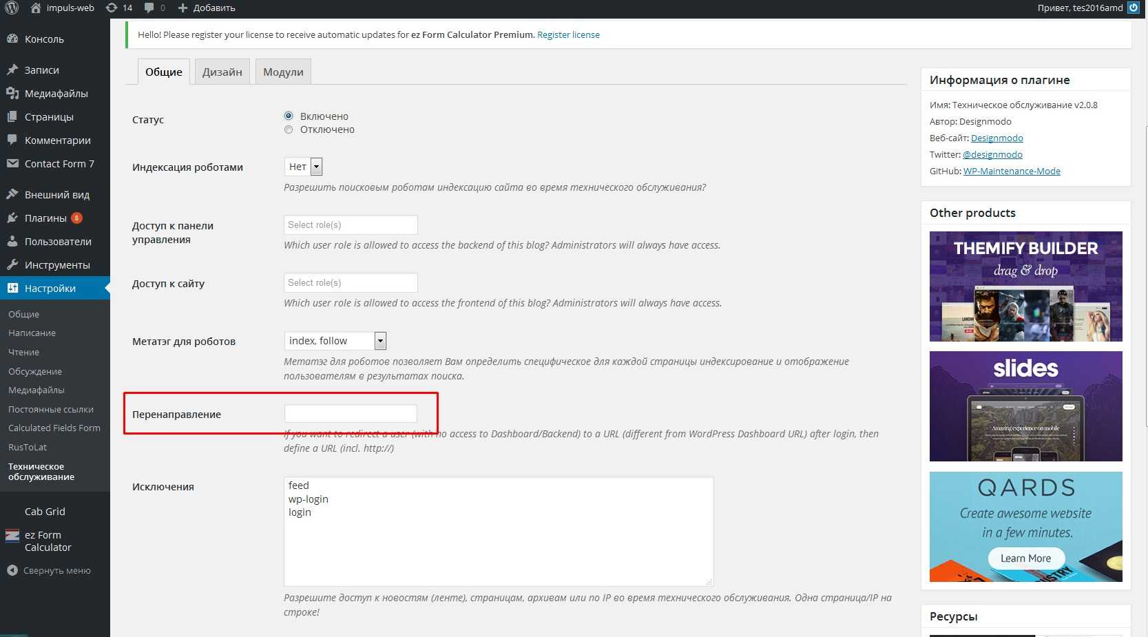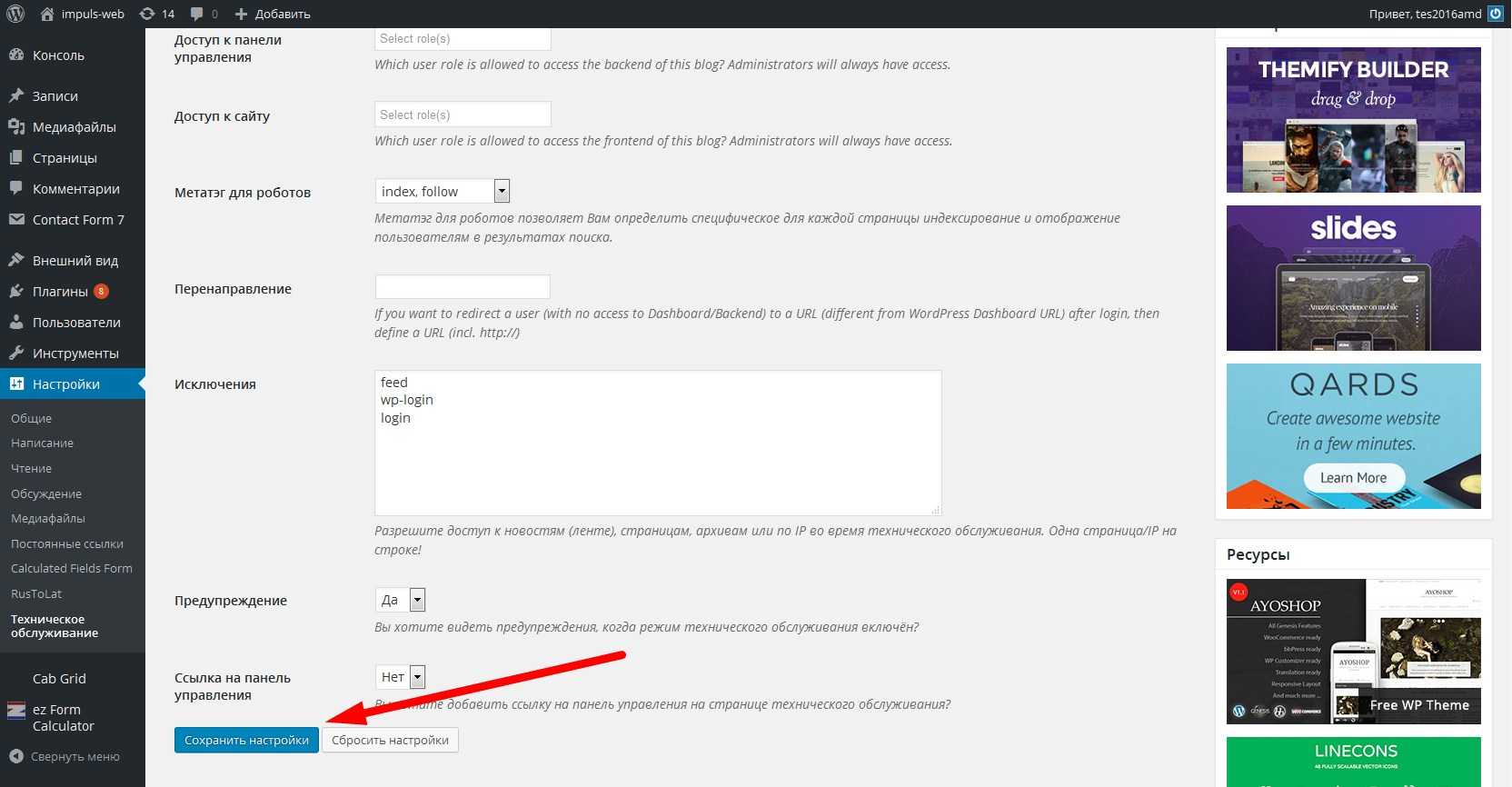 7.После того, как вы включаете режим технического обслуживания у вас, в административной части сайта, при редактировании каких-то страниц и установке плагинов, постоянно высвечивается предупреждение о том, что у вас включен режим технического обслуживания.