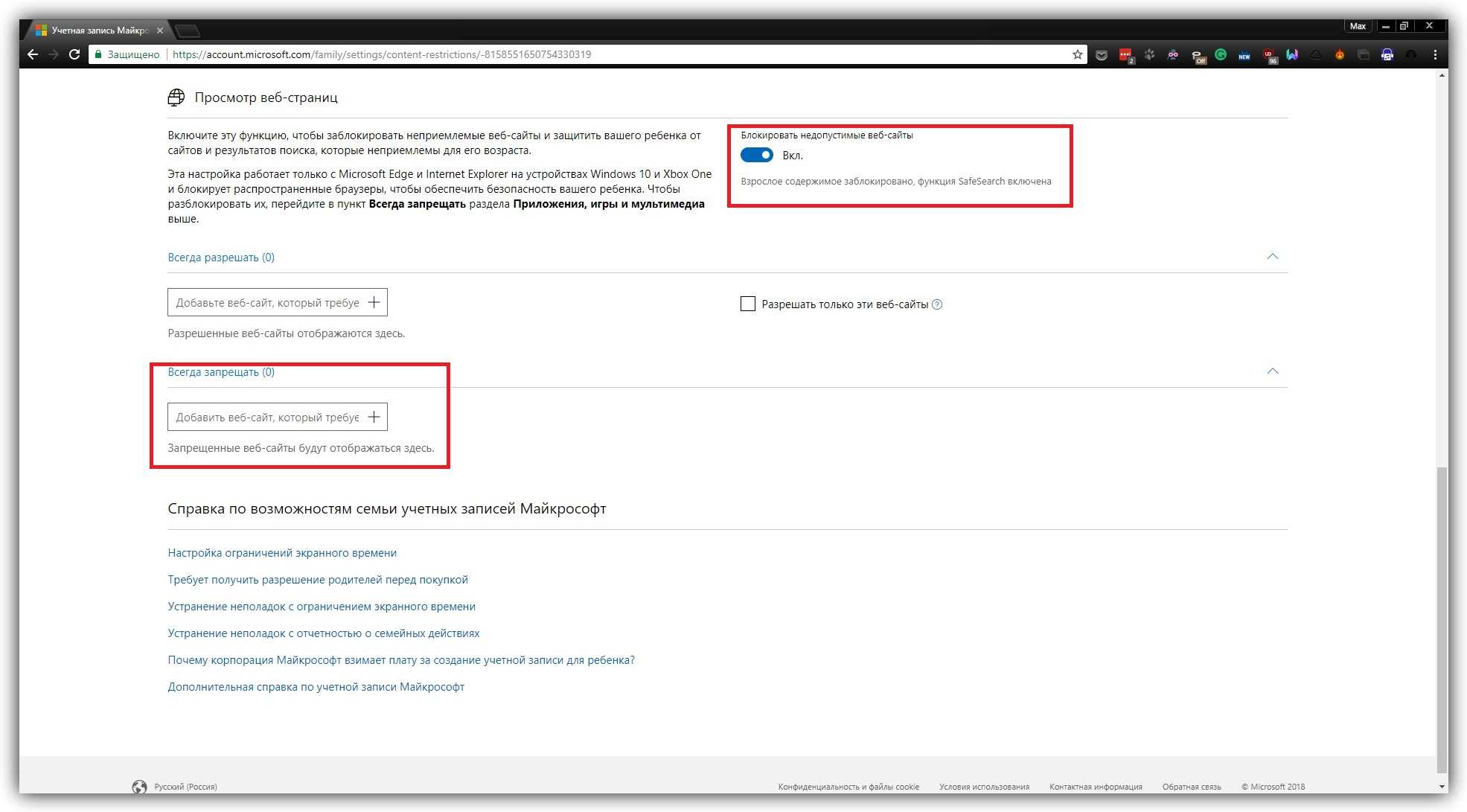Прокрутите страницу вниз до раздела «Просмотр веб-страниц». Здесь вы можете включить автоматическую блокировку сайтов с помощью переключателя «Блокировать недопустимые веб-сайты» и занести вручную избранные сайты в список «Всегда запрещать».