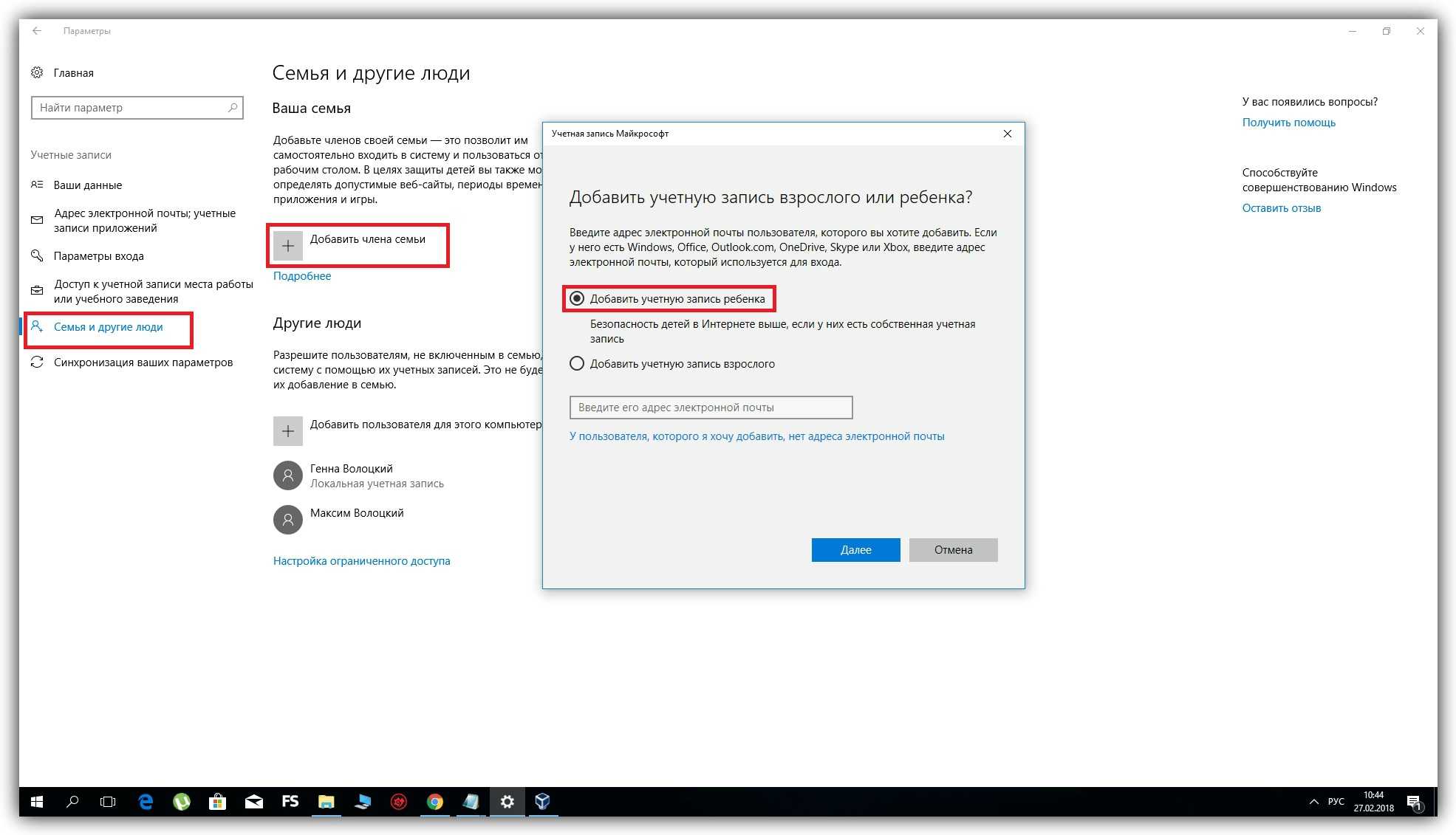 Далее, выберите на боковой панели «Семья и другие люди» и нажмите «Добавить члена семьи». В следующем окне добавьте учётную запись ребёнка с помощью подсказок системы. В процессе вам надо будет подключить к ней любой почтовый ящик, открыть его и подтвердить регистрацию нового профиля.