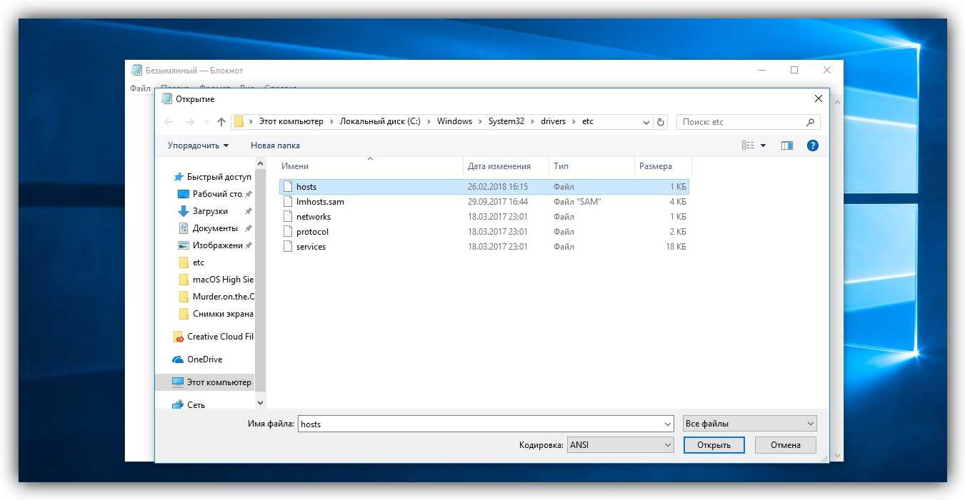 Чтобы отредактировать упомянутый файл, сначала откройте программу «Блокнот»: кликните по её ярлыку правой кнопкой мыши и выберите «Запуск от имени администратора». В окне блокнота нажмите «Файл» → «Открыть», переключите режим отображения с «Текстовые документы» на «Все файлы» и выберите файл hosts, находящийся по адресу C:\Windows\System32\drivers\etc.
