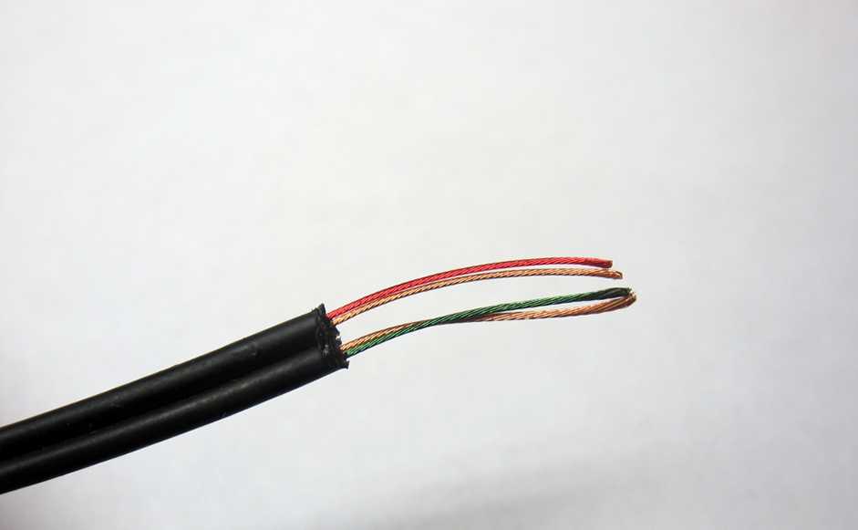 При помощи строительного ножа зачищается внешняя изоляция кабеля. Внутри находятся две жилы, промаркированные разными цветами. Наиболее часто красным цветом отмечается левый канал, зеленой краской – правый, общий канал маркируется либо синим цветом, либо желтым. Иногда общий канал представляет собой медный неизолированный провод.