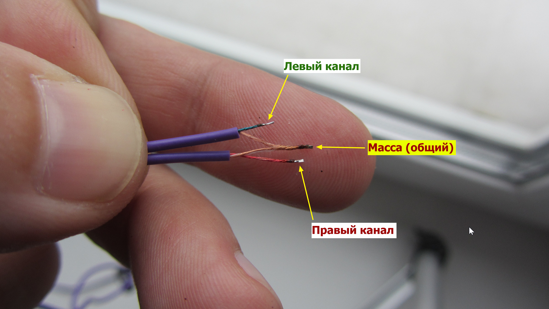 Снять наружную оплетку с кабеля, зачистить концы проводов. Лаковое покрытие снять механическим способом при помощи ножа. Облудить концы и припаять их соответственно к каналам. Левый канал маркируется красной плеткой, правый – зеленой. При наличии общего канала, его провод обычно применяется без изоляции.