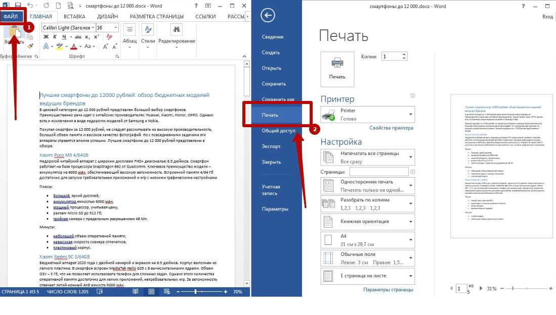 В MS Word можно просмотреть файл с текстовым содержанием перед отправкой на устройство. Программа автоматически создает копию итоговой версии. Она отображается в разделе «Печать», куда Вы можете перейти из меню или с помощью горячих клавиш.
