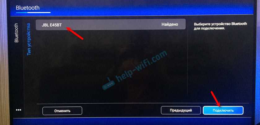 - после коммутации на телевизоре появится название ваших наушников (возможно, и других устройств с включённым Bluetooth), выбираем их и выбираем пункт меню «Подключить»;