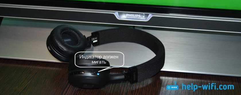 - Включить беспроводные наушники для телевизора, расположив их не далее 5-ти метров от ТВ. О режиме подсоединения свидетельствует мерцающий индикатор синего цвета.