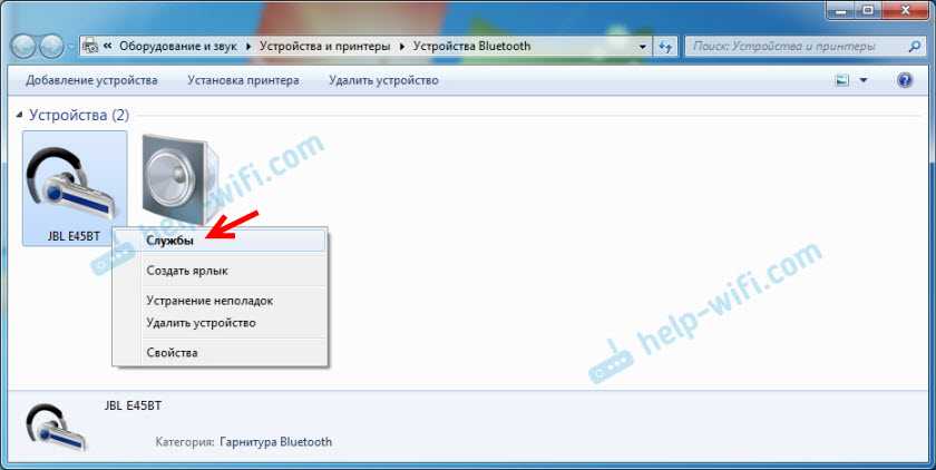 Дальше нужно нажать правой кнопкой мыши на наушники и выбрать “Службы”.