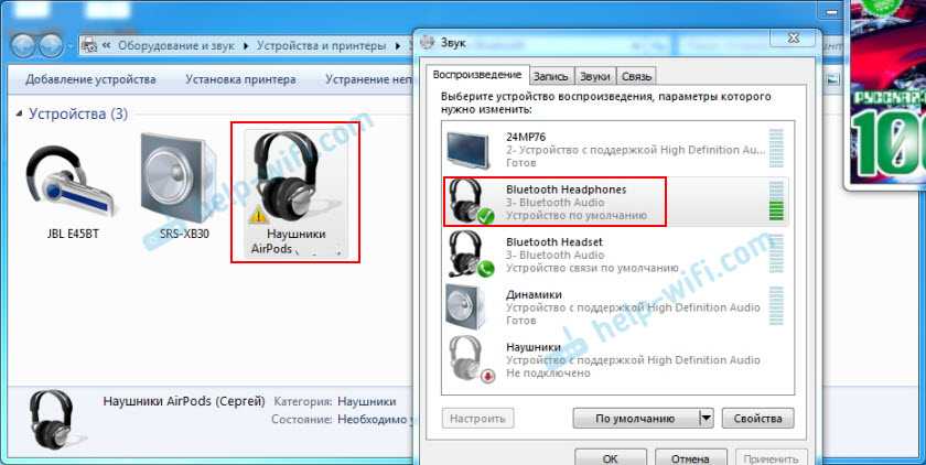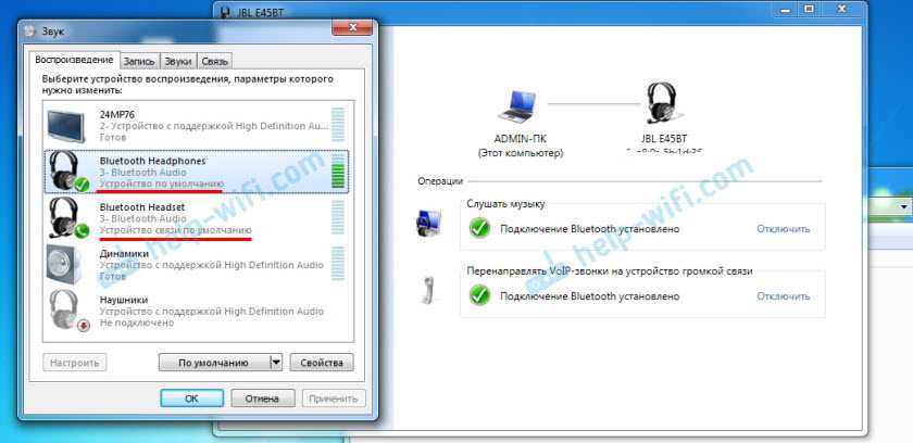После этого снова заходим в настройки звука (правой кнопкой на иконку звука в трее и выбираем “Устройства воспроизведения”) и нажав правой кнопкой мыши на “Bluetooth Headphones” выбираем “Использовать по умолчанию”. Если наушники так же будут использоваться как гарнитура (для разговоров в Skype, или в других мессенджерах), то устройство “Bluetooth Headset” делаем как “Устройство связи по умолчанию”, нажав на него правой кнопкой мыши и выбрав соответствующий пункт в меню.