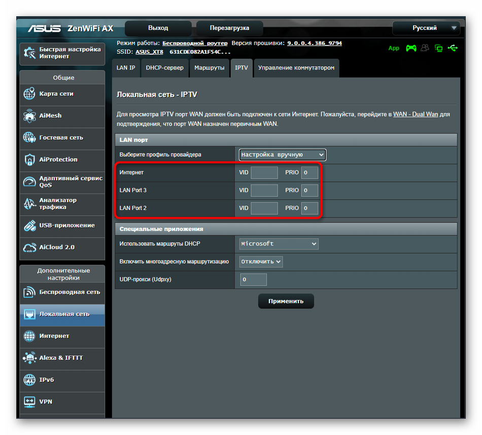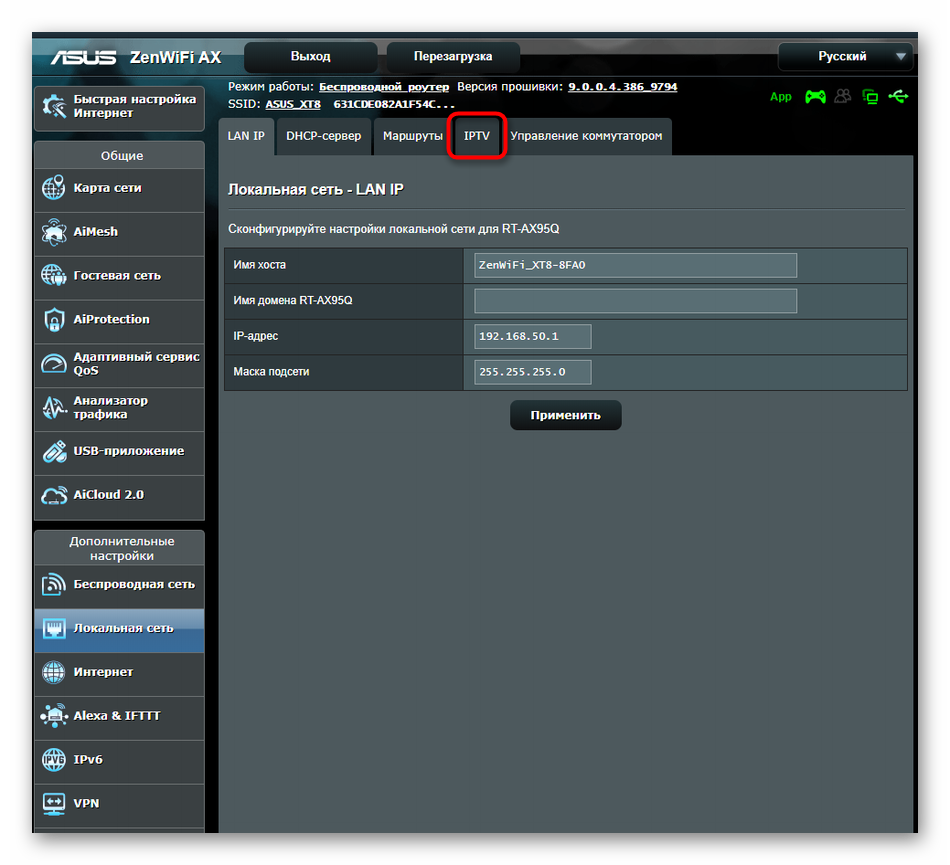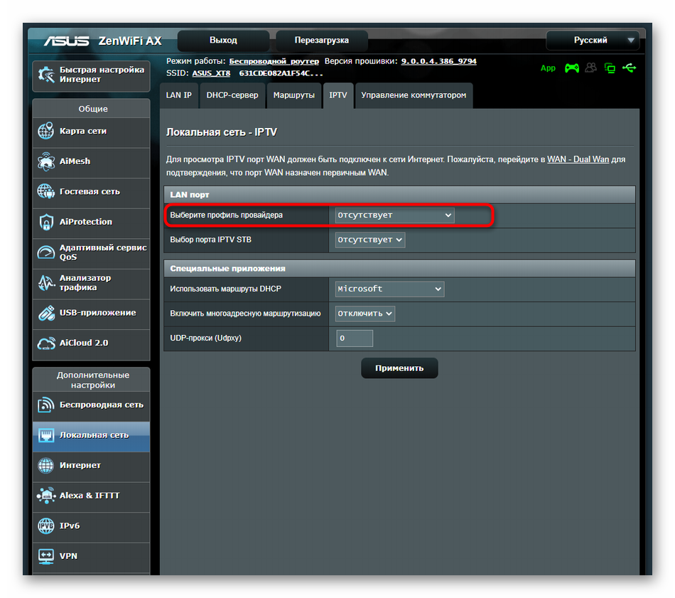 В случае с другими веб-интерфейсами, где настройка IPTV реализована на таком же уровне, принцип действий не меняется. Эту технологию также можно будет включить при запуске Мастера конфигурирования, который позволяет установить основные параметры роутера. Однако в некоторых моделях устройств эта процедура осуществляется немного иначе: пользователю требуется выбрать и интерфейс, который будет задействован для IPTV. Рассмотрим этот вариант на примере маршрутизаторов от ASUS.