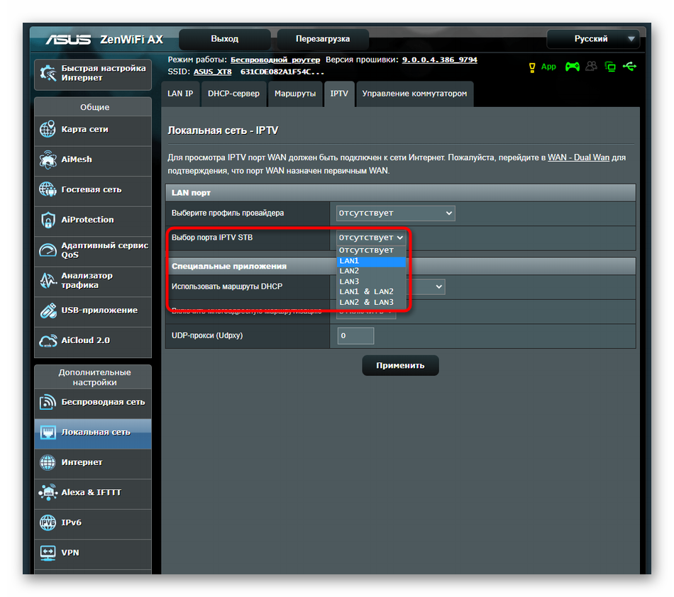 В обязательном порядке откройте список «Выбор порта IPTV STB» и укажите, через какой порт вы подключили телевизор по LAN. Каждый порт на роутере подписан, поэтому вы можете посмотреть на эти надписи, если затрудняетесь в выборе.