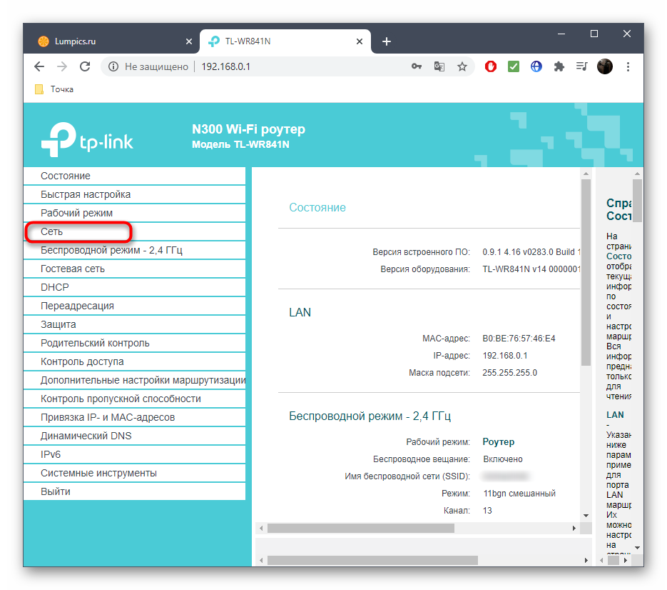 - После успешного входа в интернет-центр через левое меню переместитесь в раздел «Сеть».