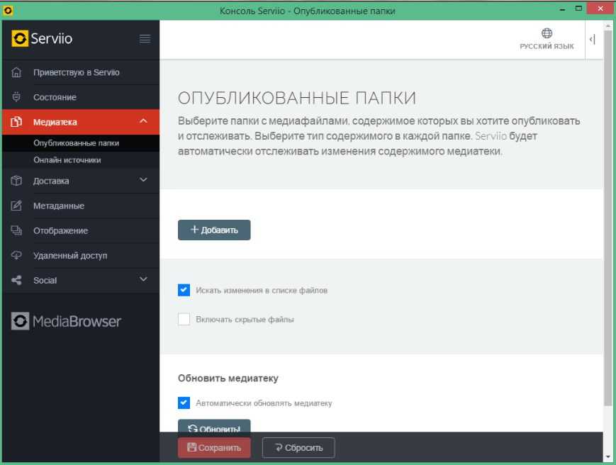 Приложение Serviio — это бесплатный набор инструментов на русском языке, предназначенный для генерации DLNA-канала. Интерфейс простой и понятный, разобраться в нем под силу даже начинающему пользователю.