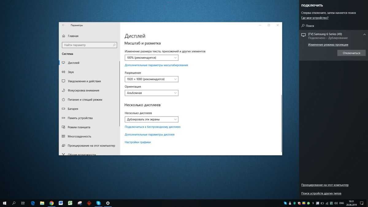 Теперь на ноутбуке с Windows 10 зайдите в «Пуск | Параметры | Система | Дисплей» и в правой части в разделе «Несколько дисплеев» нажмите на «Подключиться к беспроводному дисплею». В правой части появится вертикальная шторка с меню «подключить» и списком обнаруженных устройств. В нашем случае это Samsung 6 series (49). Нажмите на выбранную модель, после чего на самом телевизоре согласитесь с запросом на подключение. Надо отметить, что соединение может произойти не с первой и даже не со второй попытки, т.к. компьютеру необходимо время для передачи ТВ ключей шифрования сигнала. Но после того, как телевизор будет подключен к ноутбуку по WiFi, вы можете транслировать видео хоть из другой комнаты.