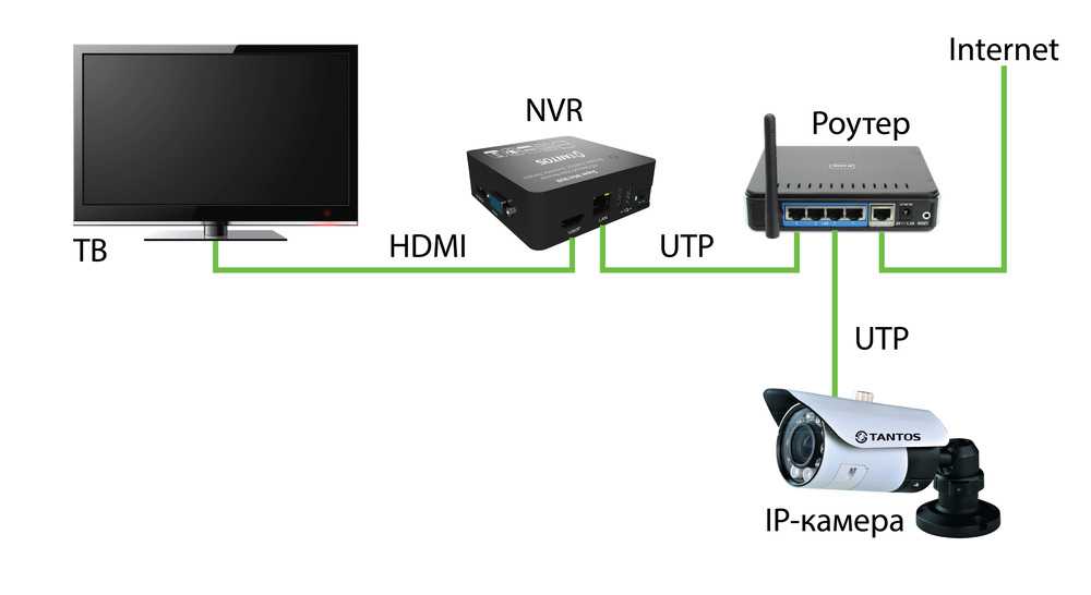После подключения камер видеонаблюдения к телевизору и сетевому видеорегистратору устройство готово к прямой трансляции картинки и сохранению ее в сетевой видеомагнитофон (NVR). При этом маршрутизатор не используется.