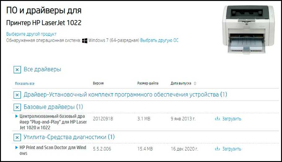 Пользователю необходимо перейти на страницу с софтом, выбрать из списка подходящую ОС и скачать драйвер принтера HP 1022 (находится в группе «Базовые драйверы»). При желании можно дополнительно загрузить утилиту «HP Print and Scan Doctor», размещенную на той же странице в группе «Средства диагностики». Этот софт предназначен для автоматического определения и устранения проблем, связанных с функционалом принтера HP LaserJet 1022 и других моделей оргтехники HP.