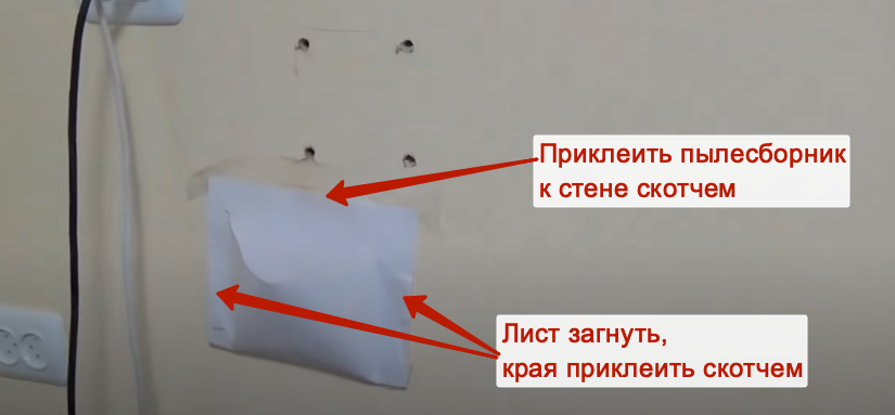 Дополнительно можно изготовить пылесборник. Нужен обычный лист бумаги, который загибается внутрь. Чтобы образовался карман, края загнутой стороны нужно чуть приблизить к центру листа. По краям обязательно нужно хорошо пройтись скотчем, чтобы сыплющиеся отходы не выпадали с пылесборника через мелкие щели.