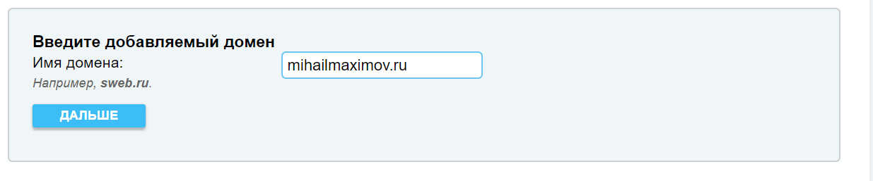 Нас интересует вкладка «Домены» — именно там делается привязка домена к хостингу. Заходим туда и выбираем «Добавить домен». В поле вводим имя нашего зарегистрированного ранее домена. Эта запись скажет хостингу: «Когда тебе придёт запрос по этому домену, обслужи его»: