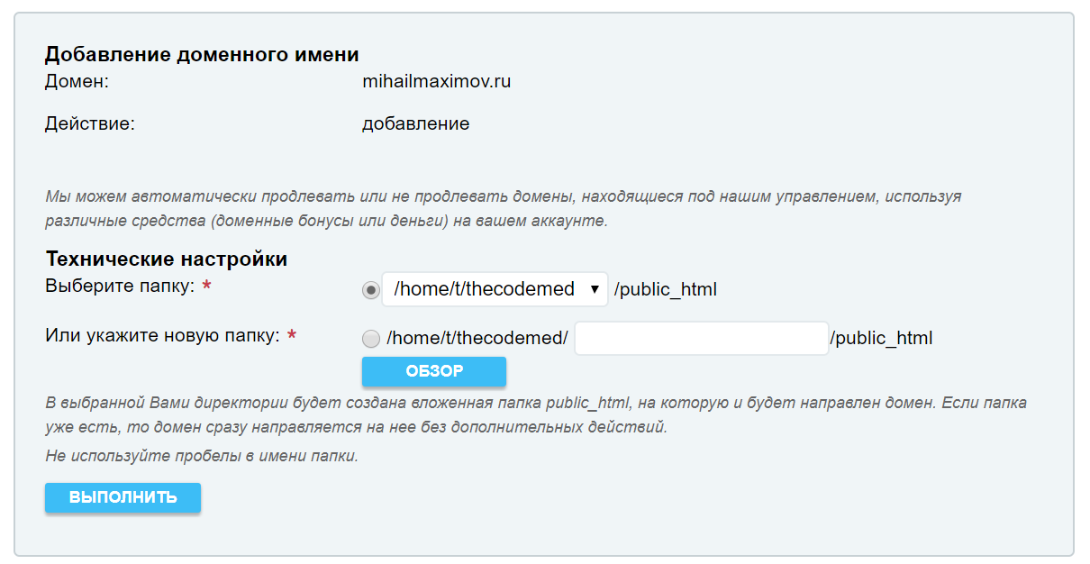 Если у нас в хостинге живёт несколько сайтов, нужно будет задать новую папку. Но так как это наш первый сайт на этом хостинге, оставим стандартную: