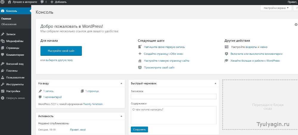 После успешной авторизации сработает перенаправление, и откроется страница админки WordPress.