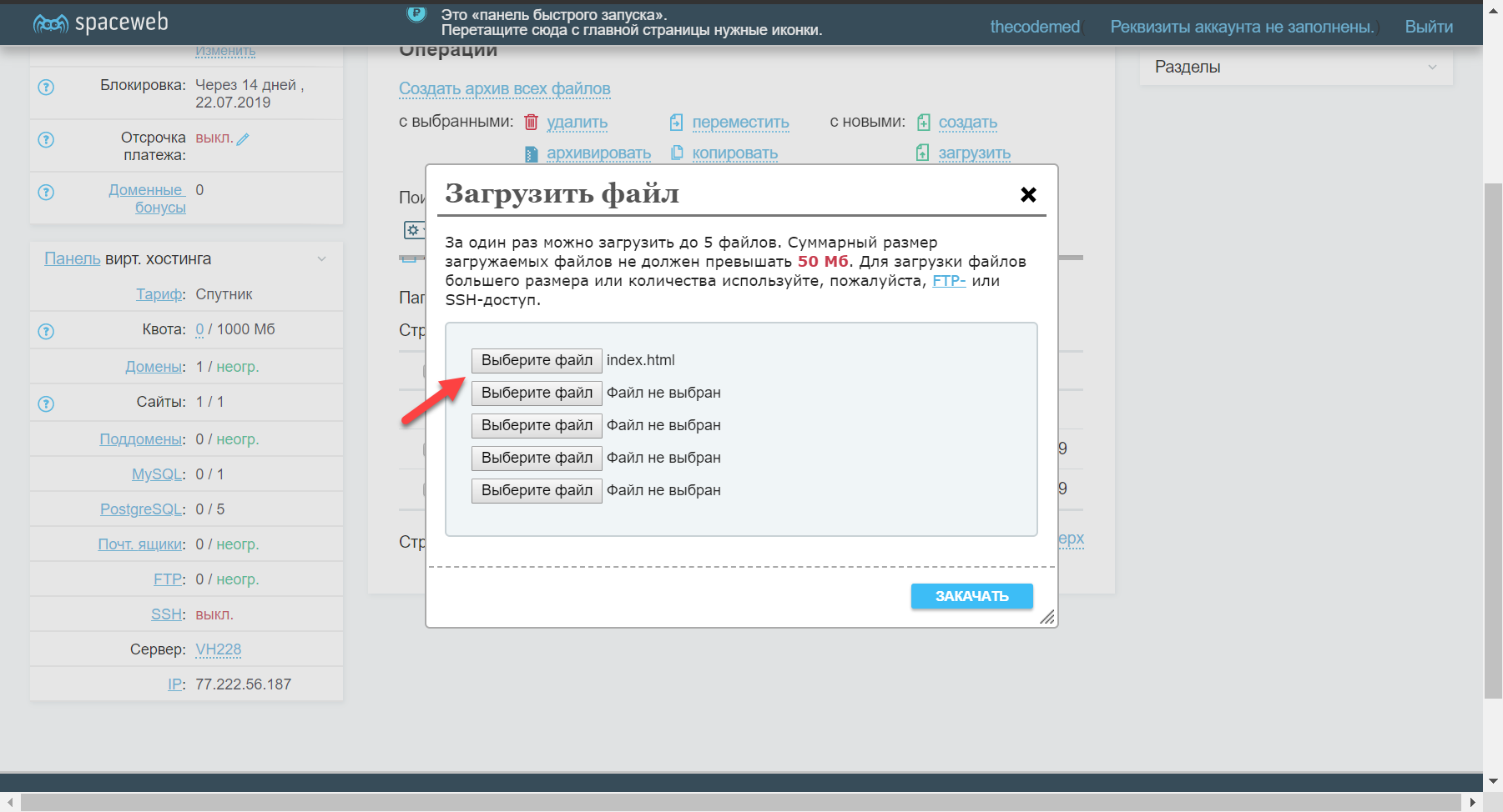 - В панели управления хостингом находим кнопку «Загрузить файл», выбираем наш index.html и подтверждаем.