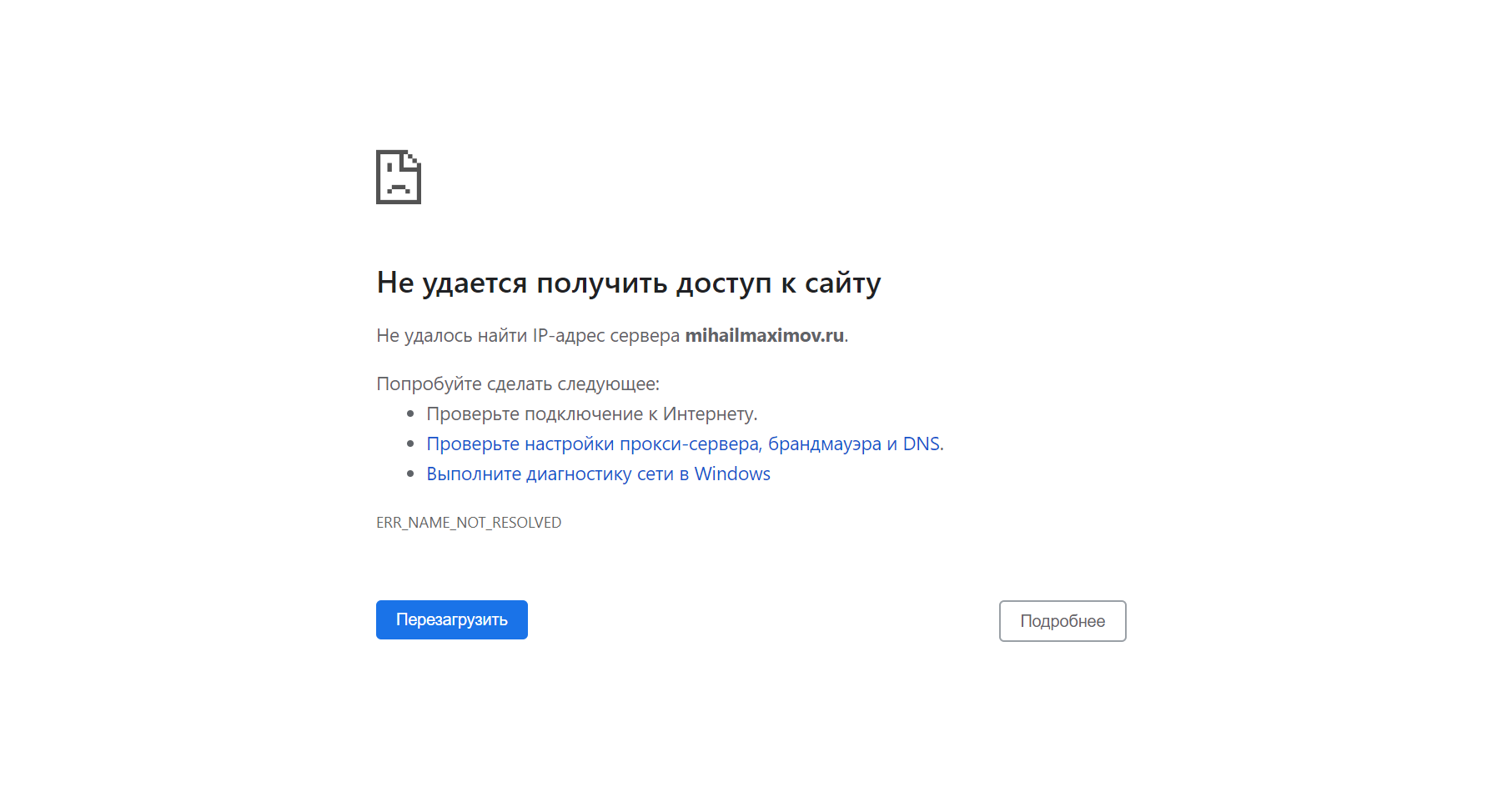 Мы научили хостинг принимать запросы по адресу mihailmaximov.ru. Но мы не научили DNS-серверы в интернете отправлять эти запросы на наш хостинг.