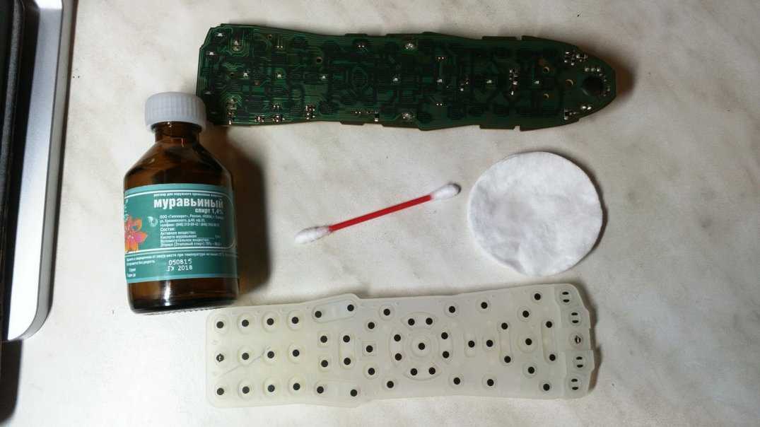 Слой грязи, оказавшийся на клавиатуре сверху или снизу (на плате, контактных площадках), является серьезной помехой в работе пульта. Чтобы восстановить работоспособность, потребуется промыть поверхности спиртом. Для этого используются ушные ватные палочки, влажные салфетки. После высыхания клавиатуру устанавливают в пульт, она должна заработать.