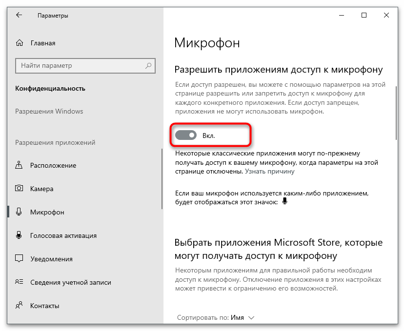 Разрешите доступ к микрофону приложениям, передвинув соответствующий переключатель.