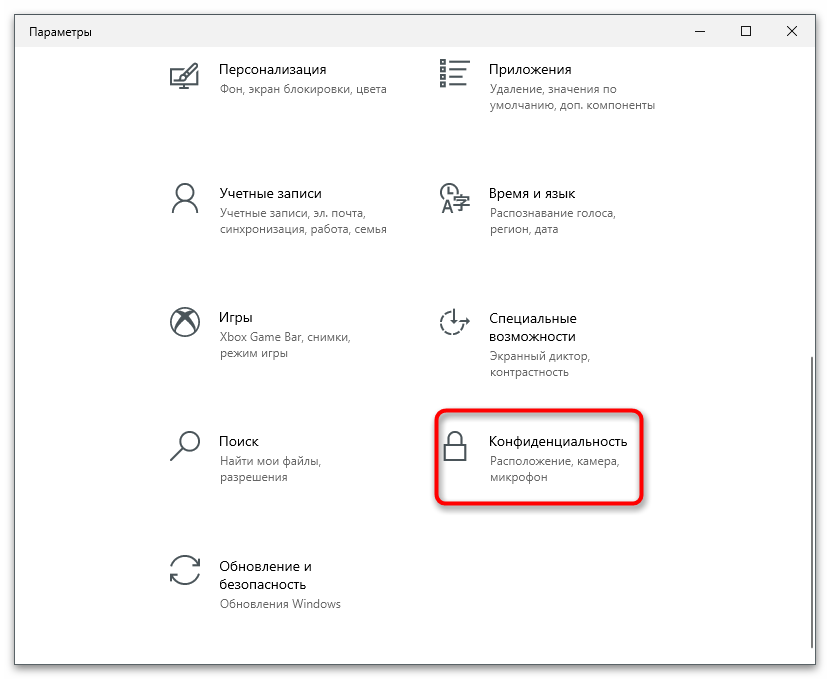 - В том же окне «Параметры» на этот раз перейдите в раздел «Конфиденциальность».