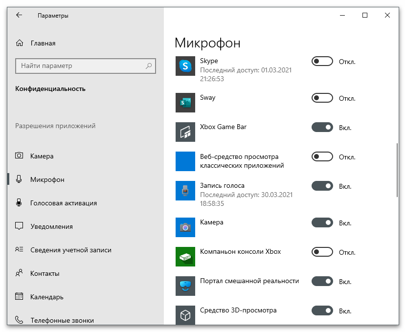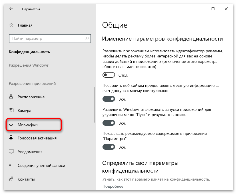 Иногда настройки операционной системы по умолчанию выставлены таким образом, что любому приложению доступ к микрофону запрещен, соответственно, оно даже не увидит оборудование, чтобы захватить с него ваш голос. Понадобится проверить параметры и изменить их на свое усмотрение, например, когда какой-то программе нужно разрешить использование микрофона, а другой — запретить.