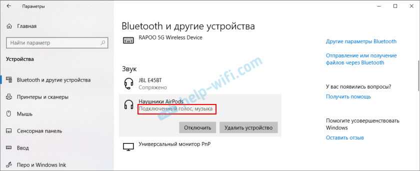 Дальше нужно проверить статус подключенных наушников. Возле них должно быть написано «Подключенный голос, музыка» (может быть только «Подключенный голос»). Это значит, что наушники могут использоваться как Bluetooth-гарнитура.