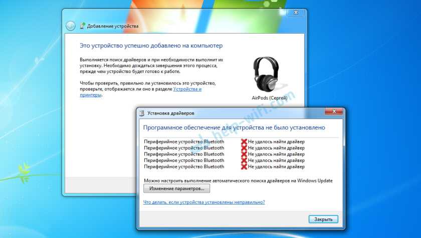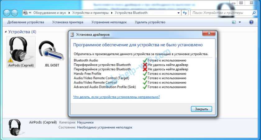 Дальше я просто удалил AirPods из списка уже подключенных устройств (так как я уже пробовал их подключить) и установил соединение заново. И уже в этот раз Windows 7 установила практически все драйвера. Кроме «Периферийное устройство Bluetooth». Но наушники без проблем начали работать, несмотря на то, что возле них остался желтый восклицательный знак.