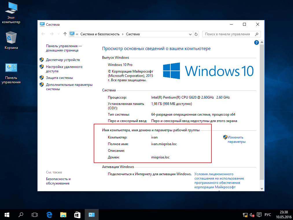 - доменное имя компьютера будет отображаться в поле «Полное имя».
