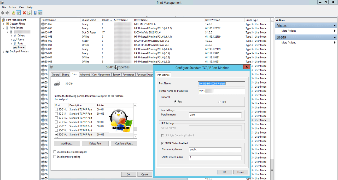 Далее выберите нужный порт и нажмите кнопку «Настроить порт». В открывшемся окне «Настройка стандартного монитора порта TCP/IP» снимите галку «Состояние SNMP разрешено» и сохраните настройки.