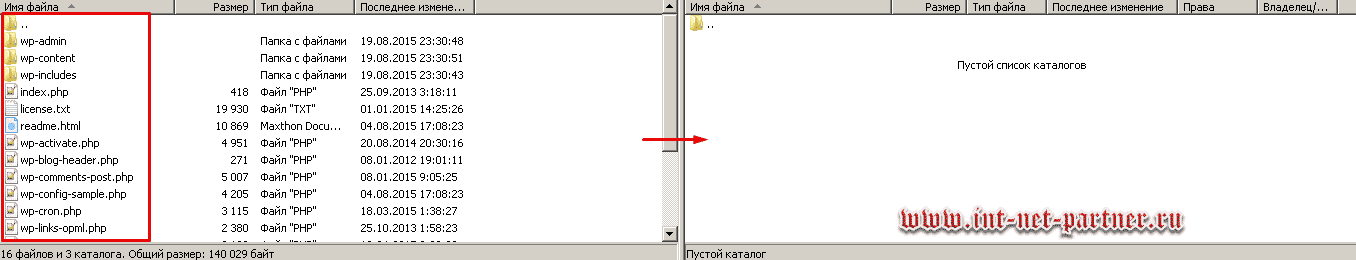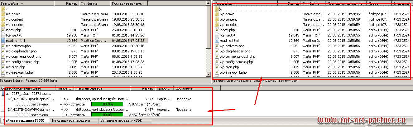 Все у меня не поместилось на скрине, но главное: вы заметили три характерные папки, название которых начинается с букв «wp». Выделяете все содержимое таким же путем, как в проводнике, и «перекидываете» его в правую часть программы, т.е. на сервер.