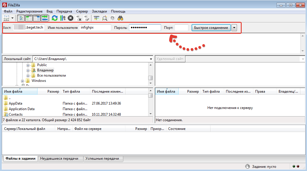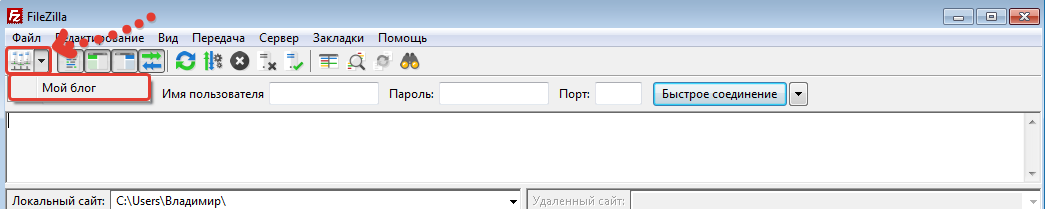 Быстрое подключение выполняется вверху программы. Там просто указывается хост, логин, пароль и остаётся нажать «Быстрое подключение». Порт, как правило, указывать не нужно. А если и нужно, то об этом должно быть упомянуто на сайте вашего хостинга.