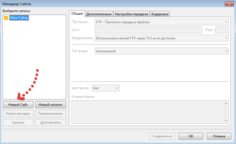 Создаем новый сайт. Справа необходимо ввести хост, имя пользователя и пароль (они пришли к вам на почту после регистрации):