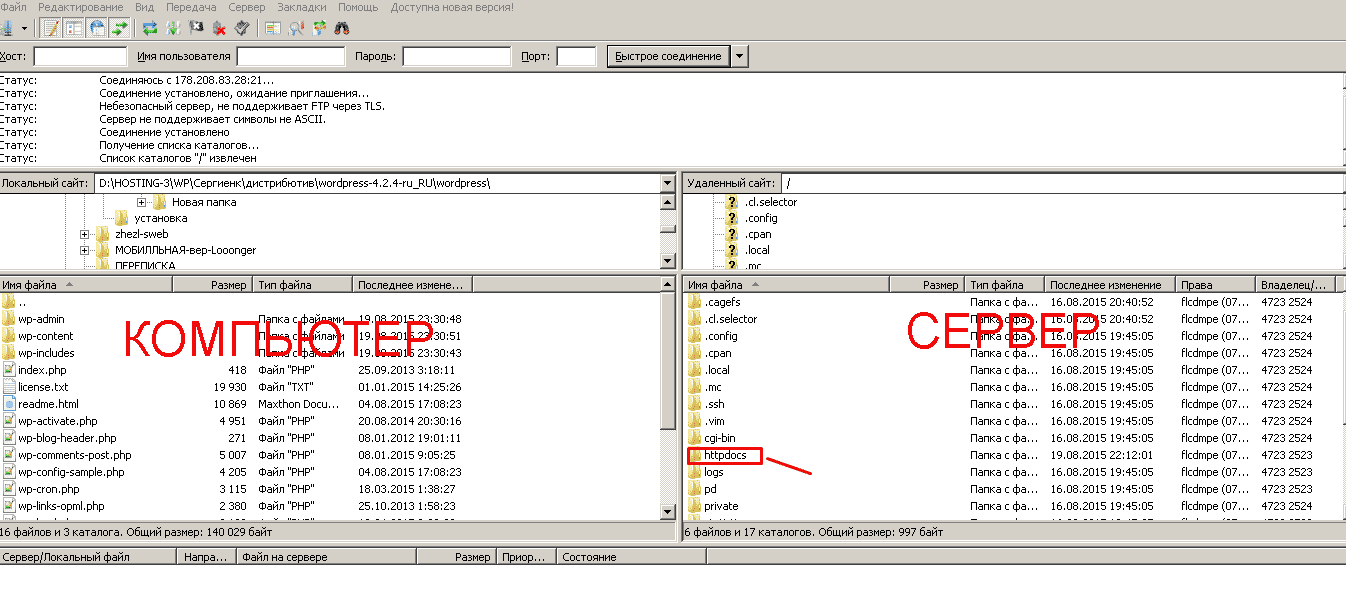 Помните, что у нас стояла задача: закачать содержимое WordPress на сервер? Вы уже увидели на скриншоте выше, что в программе с левой стороны находятся файлы компьютера, а справа – сервера?