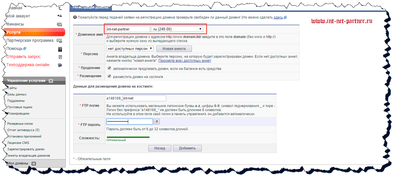После этого вам необходимо будет ввести данные для регистрации домена, данные для FTP-доступа. Как вы успели заметить домен в зоне .ru стоит 249 рублей.