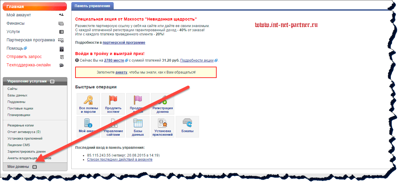 Давайте посмотрим, где можно найти этот бесплатный домен в панели управления mchost, как вы помните, имя домена было прописано системой автоматически.
