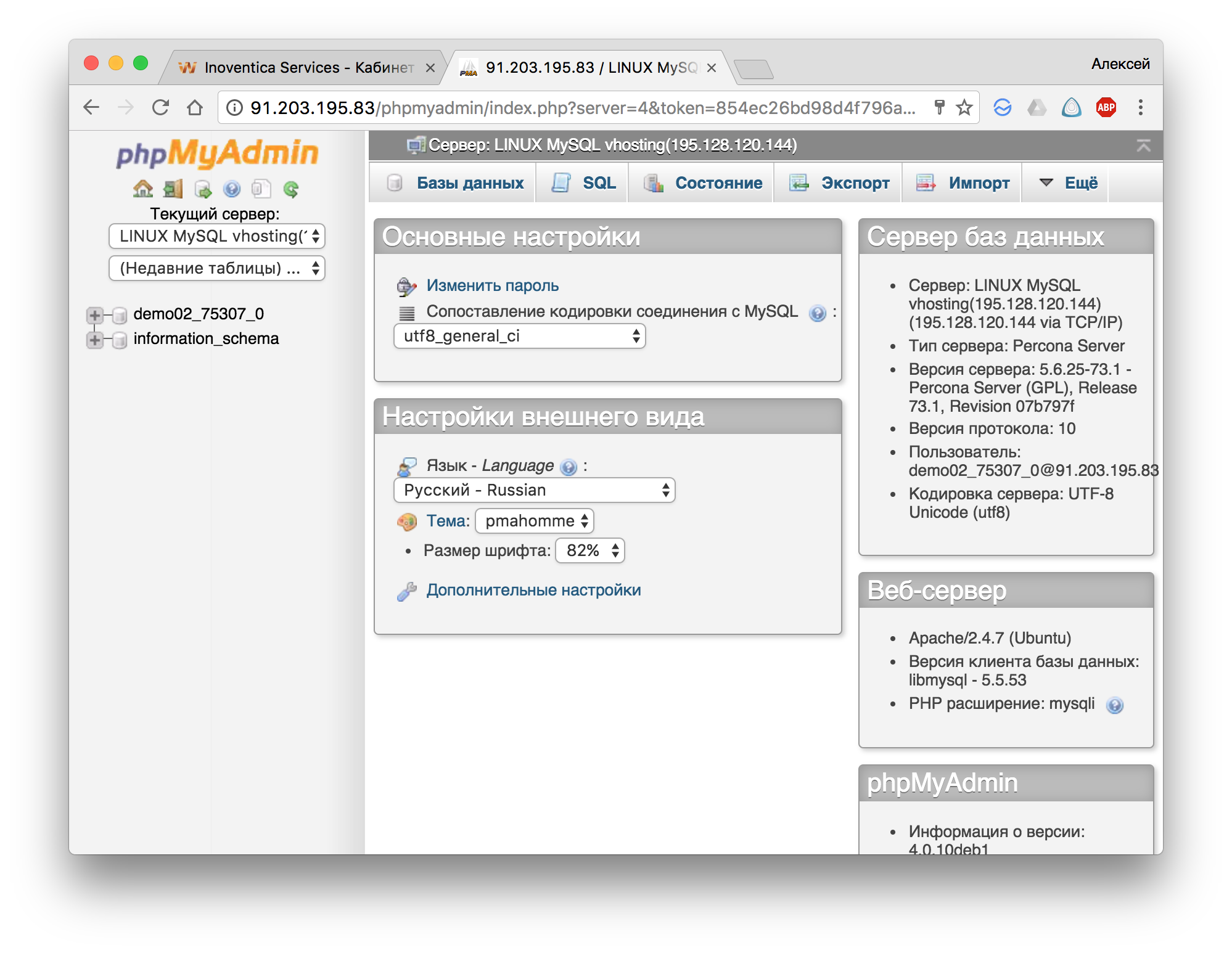 2.) Адрес сервера, на котором расположен phpMyAdmin — 91.203.195.83. Чтобы открыть окно phpmyadmin, необходимо набрать в окне браузера строку — http://91.203.195.83/phpmyadmin/